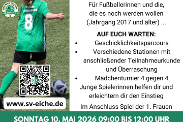 Am 10. Mai 2026 von 9 bis 12 Uhr veranstalten wir unseren diesjährigen „Tag des Mädchenfußballs“ bei der Eiche. Kommt vorbei und erlebt einen spannenden Tag mit verschiedenen Stationen und Spielen zum Ausprobieren und Kennenlernen Weiterlesen…